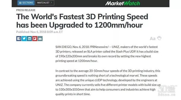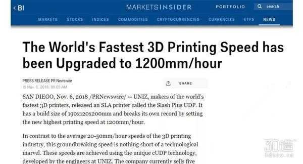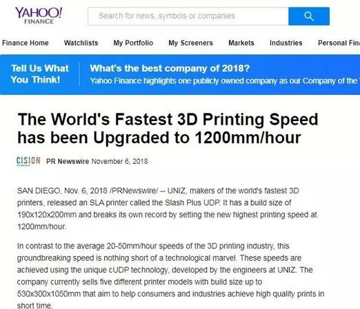 據(jù)多家外媒報道,美國東部時間2018年11月6日,早上 8:09 ,全球最快3D打印速度再次被UNIZ科技改寫!UNIZ科技的桌面級3D打印機(jī)在cUDP(連續(xù)單向剝離)超高速模式下,實現(xiàn)了1200mm/Hour驚人打印速度。而同行業(yè)的其他3D打印機(jī)平均打印速度在20-50mm/hour。